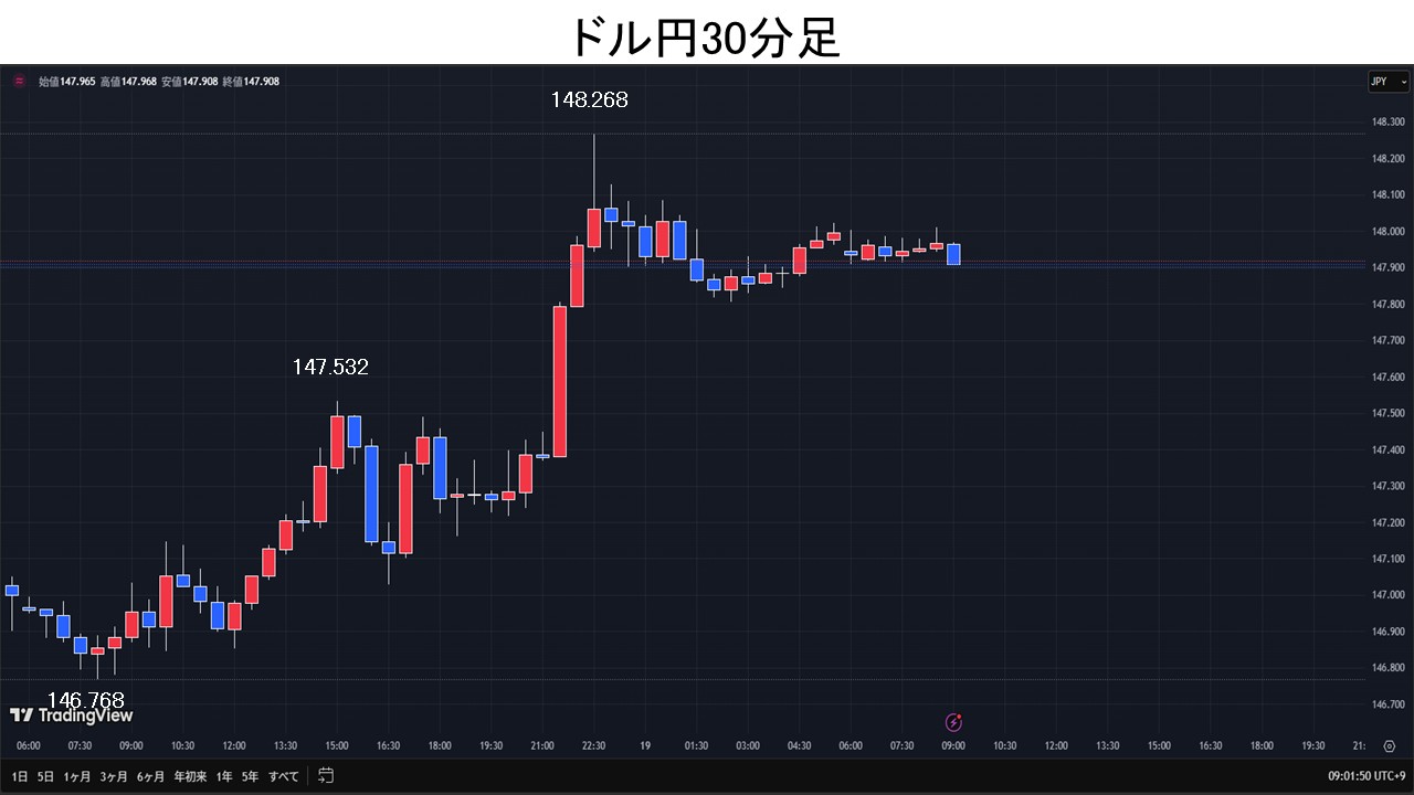 FOMCでは0.25%の利下げを決定、ドル円は一時145.48円まで下落。