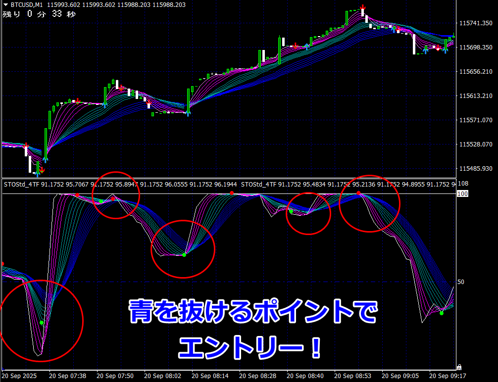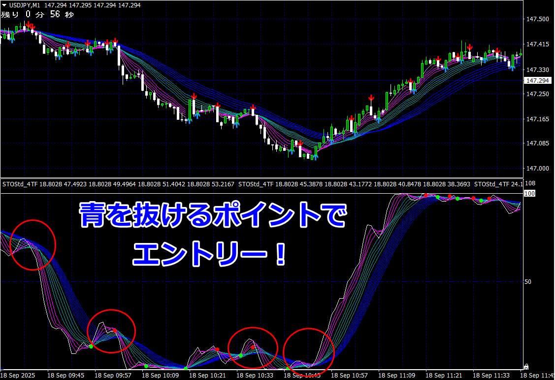 インジケーターの帯はピンク・緑・青の3層構造で、3層の帯は、収斂と拡散を繰り返しますので、 上昇時は、上から ピンク・緑・青 の並びとなり、下落時は、その逆で、上から青・緑・ピンクの並びになります。