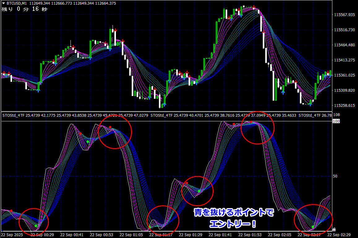 インジケーターの帯はピンク・緑・青の3層構造で、3層の帯は、収斂と拡散を繰り返しますので、 上昇時は、上から ピンク・緑・青 の並びとなり、下落時は、その逆で、上から青・緑・ピンクの並びになります。