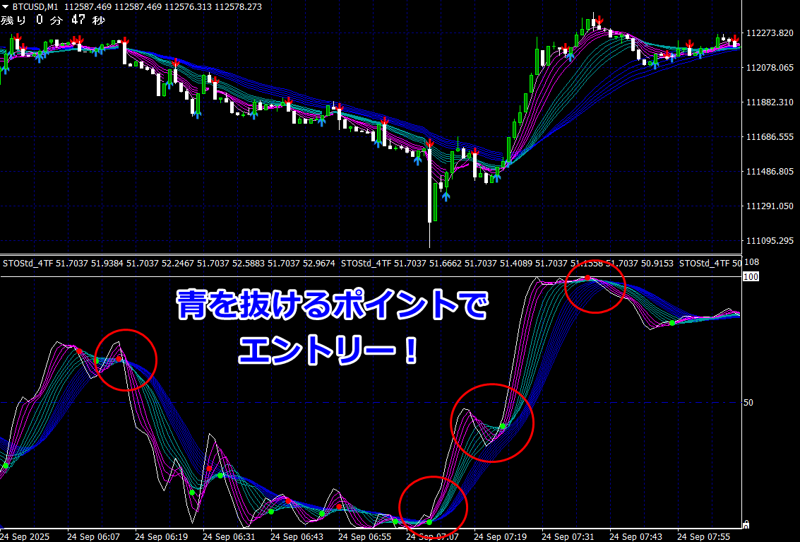 本日(11/2)の【勝てる形】だけ捉えてエントリー!(ETHUSD 1分足)★ サイン点灯後、ピンク帯が緑帯に覆いかぶさる形状で必勝エントリー!(画像クリックで拡大) 【勝てる形】とは?!エントリー