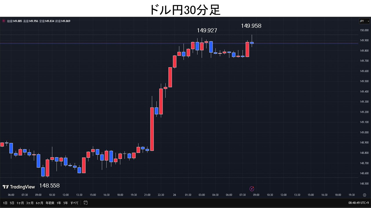 東京時間、ドル円は、148.55円まで下押しとなるが、その後は148.80円台まで買い戻された。欧州時間、ドル円は148円台後半でもみあい。NY時間、4-6月期米国内総生産(GDP)確定値や8月米耐久財受注額、前週分の米新規失業保険申請件数、8月米中古住宅販売件数などが予想より強い内容となると、米10年債利回りの上昇とともにドル買いが先行。ドル円は一時149.92円と8/1以来の高値を付け続伸となった。