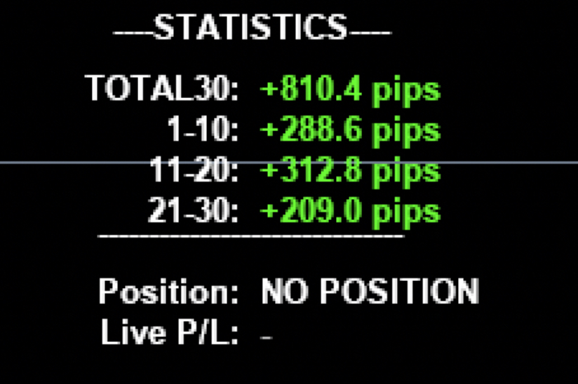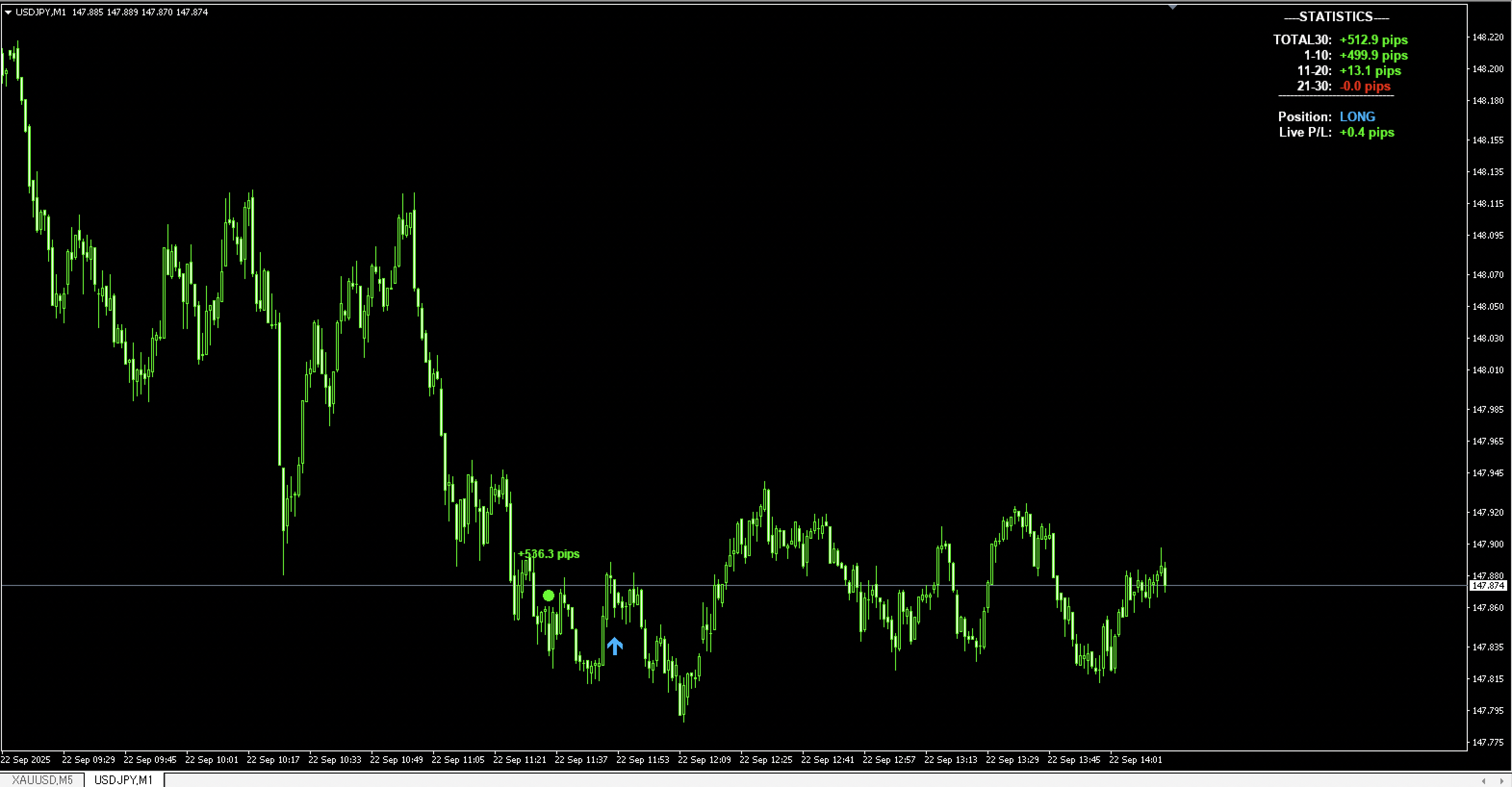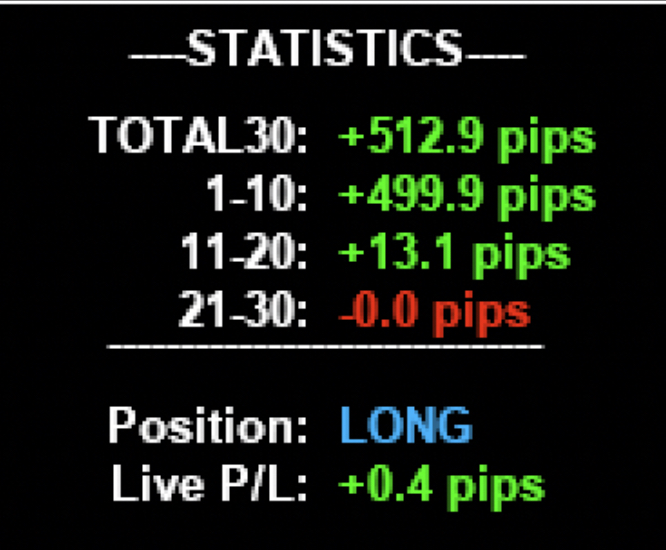 ドル円では1分足の直近30取引で512PIPS以上を獲得。