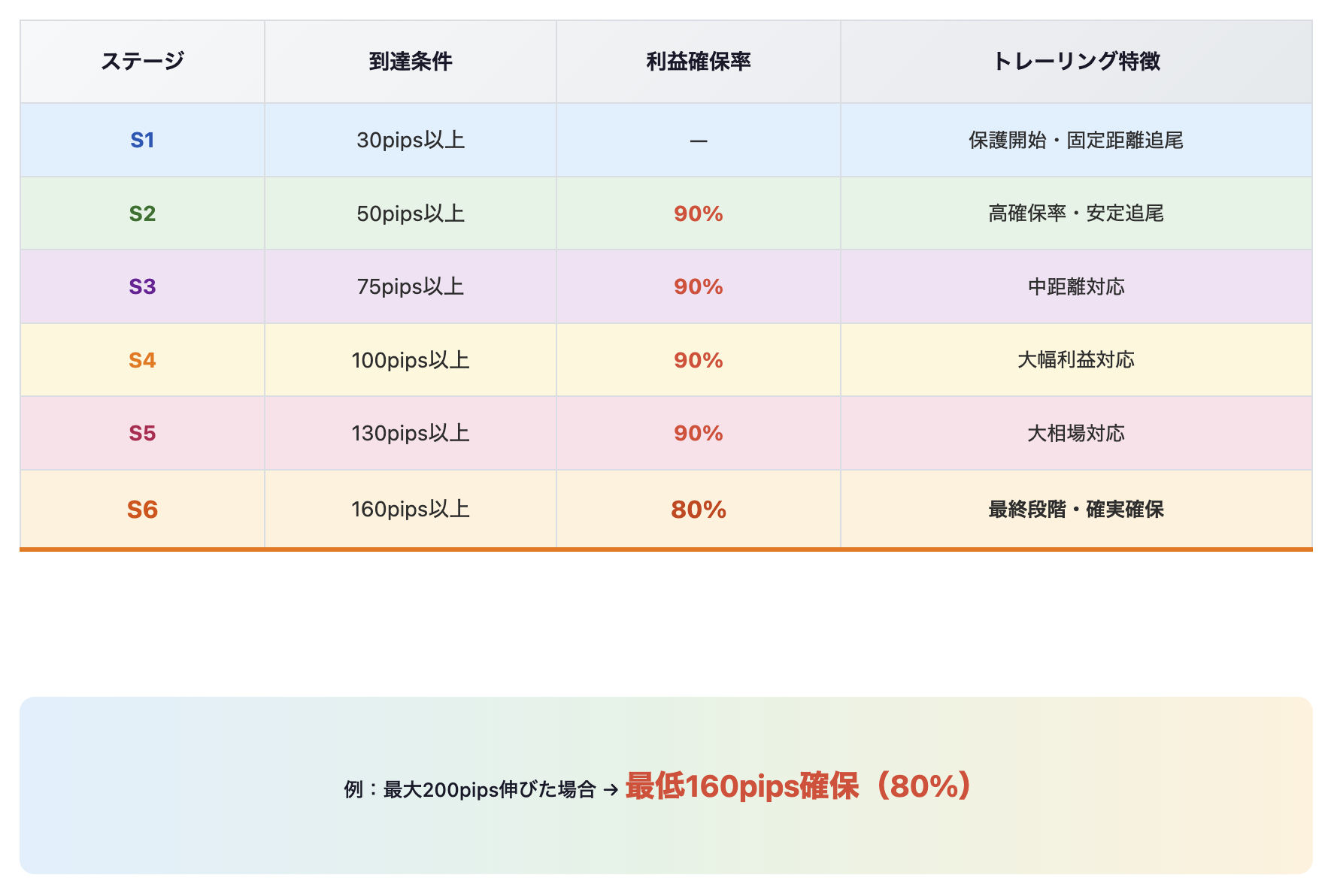 - 最終ステージ: 最大利益の80%を必ず残すように切り替わります。最大100pips伸びた場合、最低でも80pipsは手元に残ります。