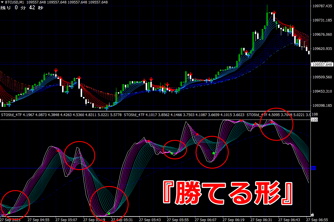 ② 矢印サイン点灯状態で、インジケーターのピンク色の帯が、緑の帯を下からすくい上げるような形状であれば、現在のローソク足が確定する数秒前か確定の直後に1分判定または3分判定でハイエントリーします。