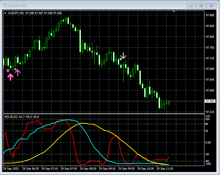 質実剛健FX mBDSR(RCI2本フィルター)のサインとR1R2S2のサインの両方を活用する(57) 豪ドル円 5分足