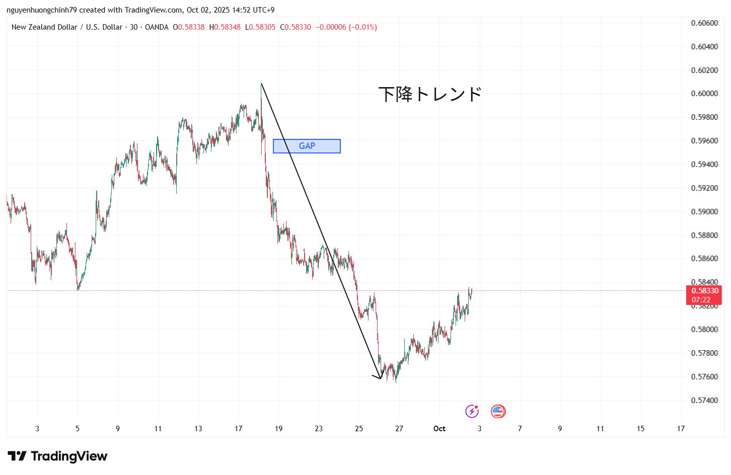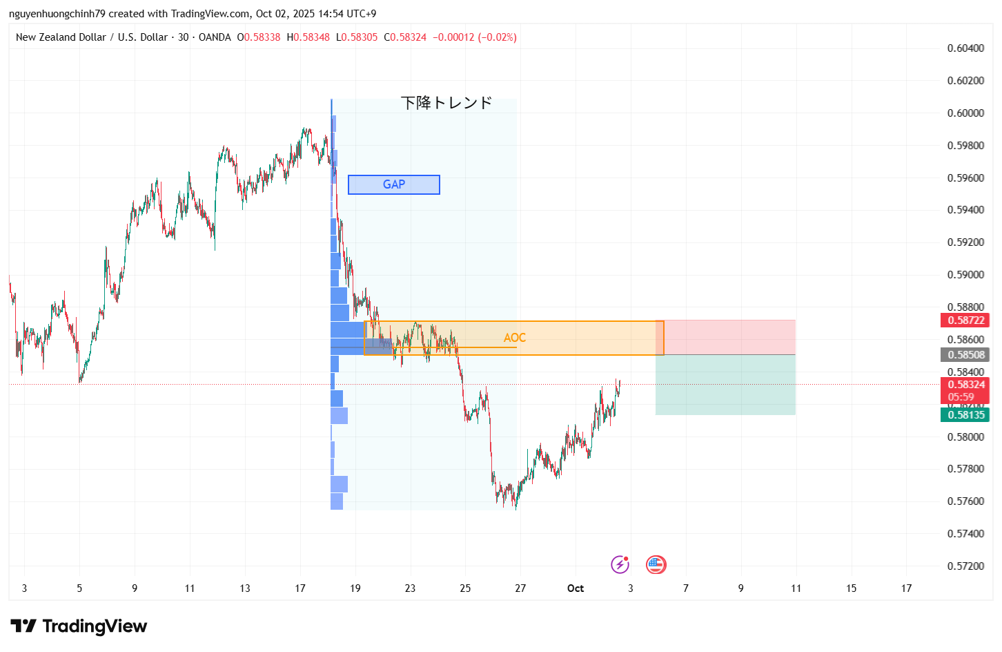 2025年10月2日、日本時間14:54、NZDUSDの30分足チャートを分析しました。