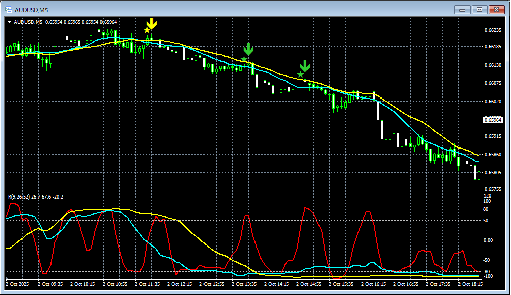 上の5分足では、mBDSR(RCI2本フィルター及び移動平均線フィルター)のサインがタイミングよく点灯しています。