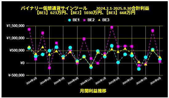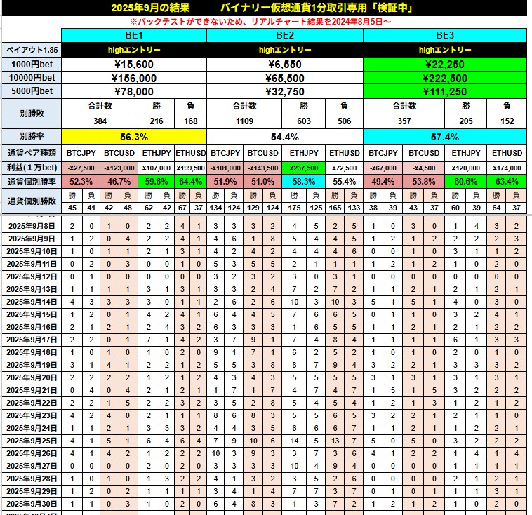 【月間結果:9月】バイナリー仮想通貨1分足判定用 オリジナルツール「BE」 BE2は、2024.2月~サイン通りで1030万円
