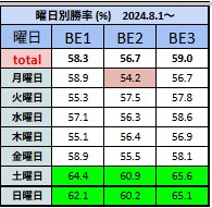 バイナリー仮想通貨1分判定用「BE」は、8時~翌朝5時までの勝敗と曜日別の結果も集計しております。