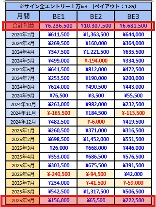 (※ペイアウト1.85 サイン全エントリー 1万bet想定)