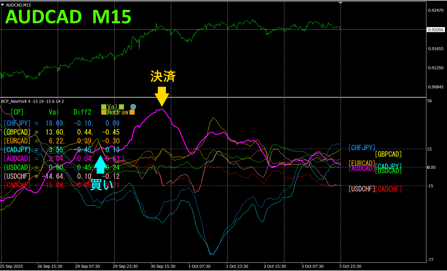 上半分は、AUDCADの15分足チャートです。下半分は、「8CP見える化インジケータ」によるものです、赤紫太線のグラフがAUDCADに相当します