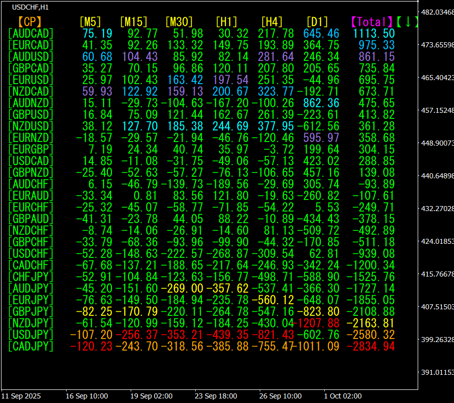 [Total]数値の降順に並んでいます。一番下にあるCADJPYは、全ての時間足で赤色系の表示色になっています。Total数値が
