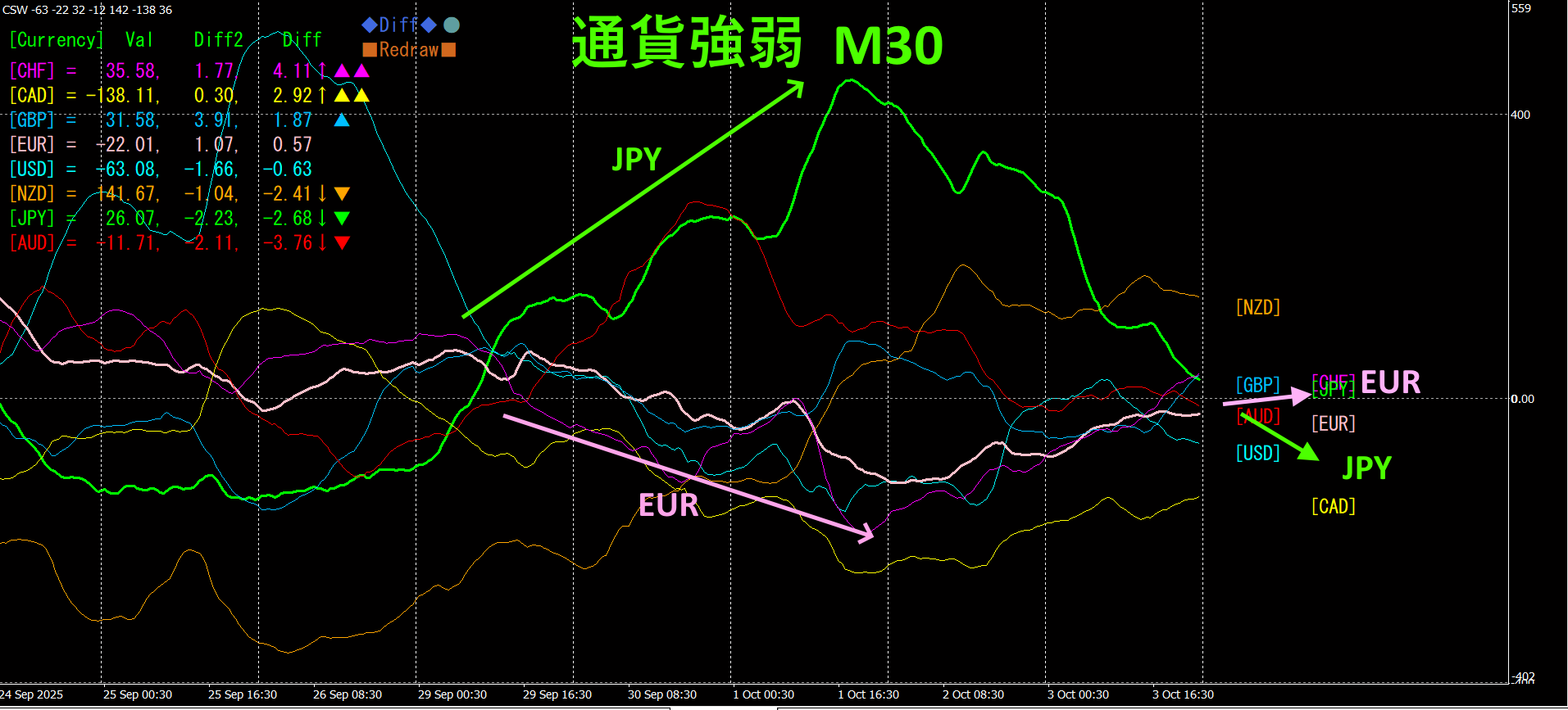 ピンク色がEUR、緑色がJPYです。EURもJPYも、水平からやや上向きになっています。通貨強弱としては、EURがJPYの上に位置するので、EUR>JPYの関係ですが、方向感が読めません。EURJPYは、レンジ気味に推移するものと考えられます。