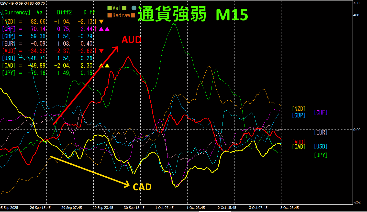 15分足の通貨強弱グラフを見ると、AUDとCADが、見事な逆相関関係になっていることがわかります。AUDとCADが収束から拡散に向かう時に、AUD>CADなので、AUDCADの買いで利益が得られます。