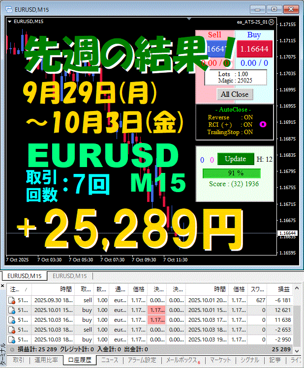 M15 週間報告!【EURUSD】ATS-25 ☆10月6日(月)~10月10日(金)