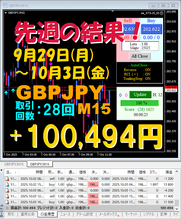 M15 週間報告!【GBPJPY】ATS-25 ☆10月6日(月)~10月10日(金)