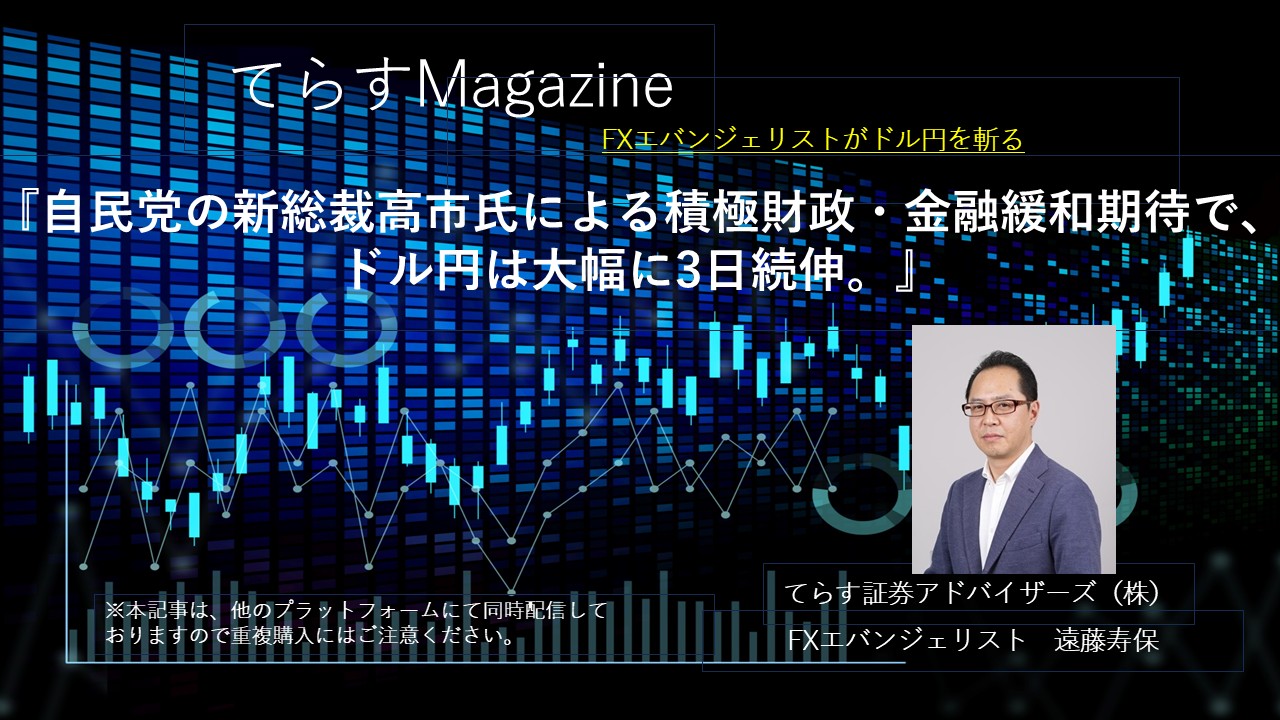 自民党の新総裁高市氏による積極財政・金融緩和期待で、ドル円は大幅に3日続伸。