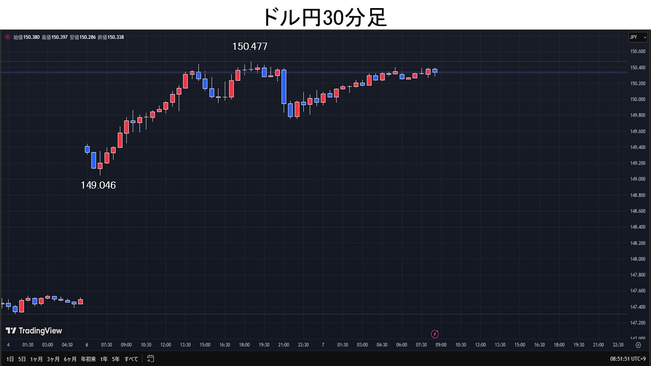 東京時間、ドル円は、10/4に行われた自民党総裁選で、財政出動や金融緩和に積極的な高市氏が選出されると、週明け早朝から大きく窓を開けてスタート。日経平均が暴騰したほか、本邦実需勢のドル買い観測などで、一時150.47円と8/1以来の高値を更新。欧州時間、円安・ドル高の流れが継続。NY時間、高市自民党総裁の経済ブレーンの1人である本田悦朗元内閣官房参与が「1ドル=150円を超えたら、やや行き過ぎだろう」との認識を示すと、ドル円は一時149.75円まで下押し。売り一巡後は徐々に下値を切り上げた。