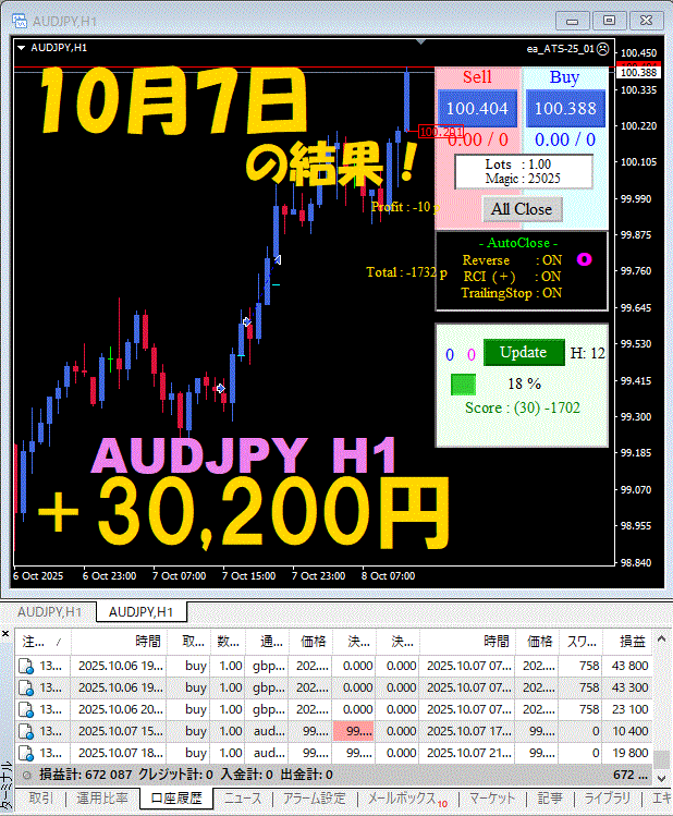 【前日の結果】AUDJPY H1 / M5 『ATS-25』10月7日