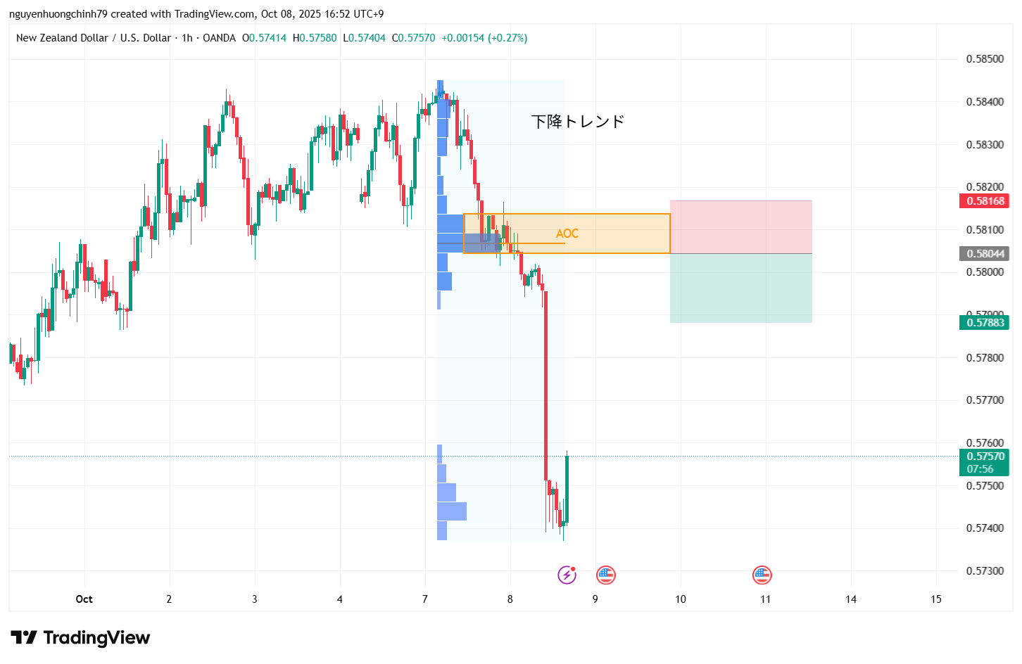 この分析をさらに裏付けるため、直近の値動きをVolume Profileで分析しました。その結果、AOC (Area of Control)、つまり大量の出来高が集中したゾーンが0.58044付近にあることがわかりました。これは売り勢力が積極的に参加したポイントであり、価格が戻ってきた際のレジスタンスゾーンになる可能性が高いと考えられます。
