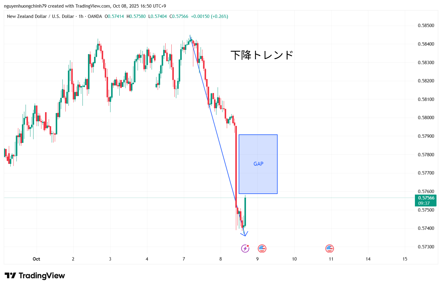 2025年10月8日、日本時間16:52頃、1時間足チャートのNZDUSDペアを分析しました。