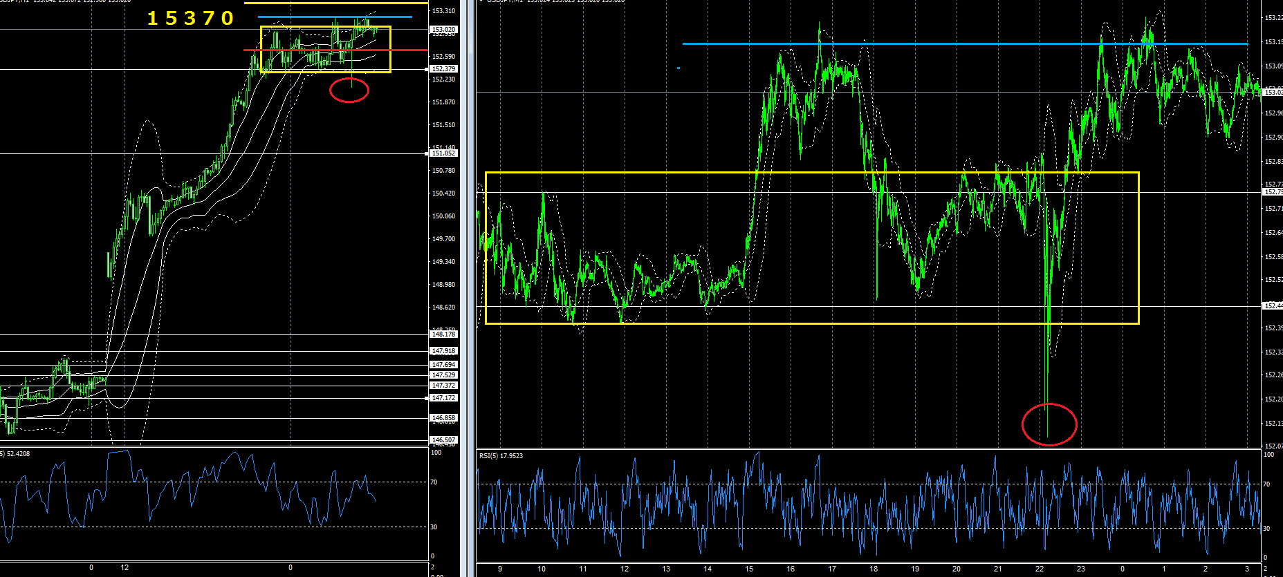 まぁ、低次元な話はさておき、ドル円1時間&1分足チャート