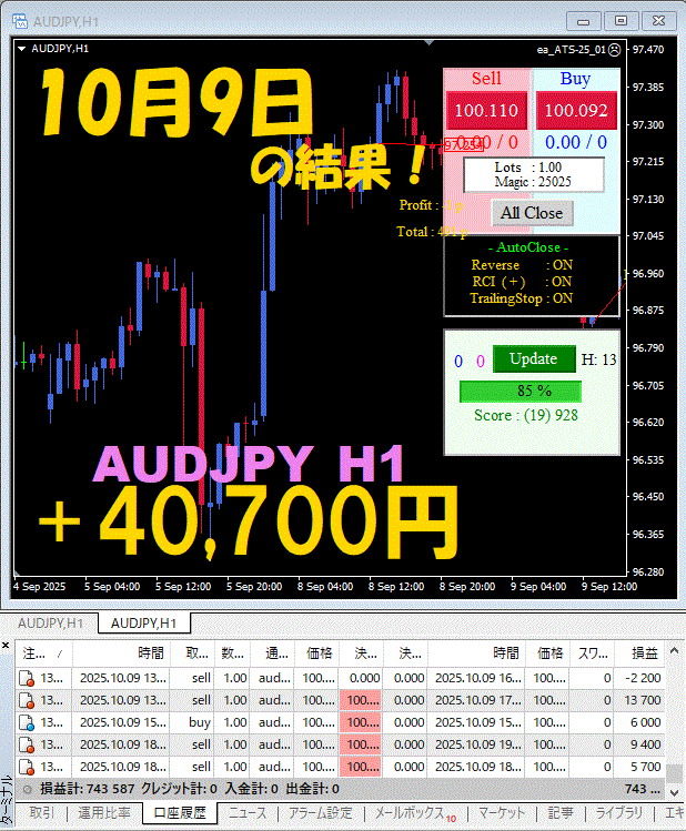 【前日の結果】AUDJPY H1 / M5 『ATS-25』10月9日