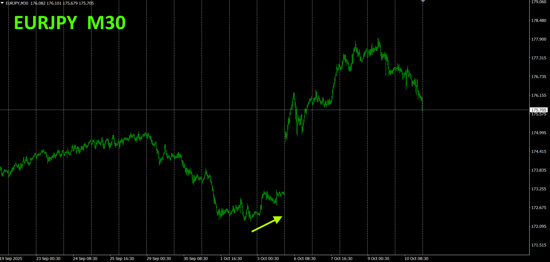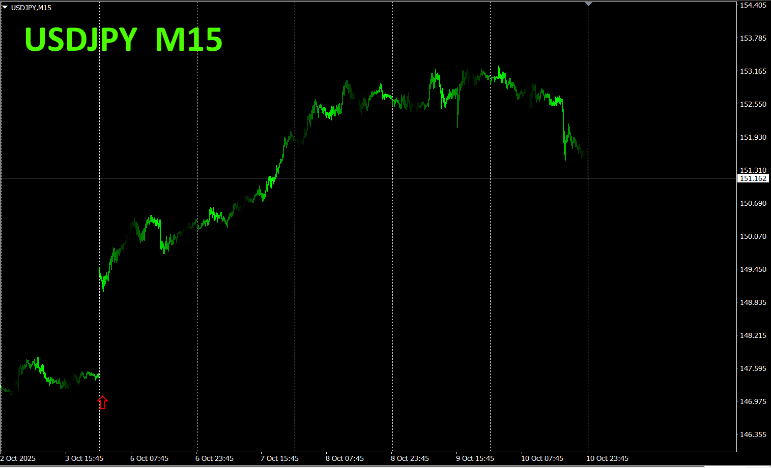 赤色の矢印がスクリーンショットを撮影した所です。大きく急騰しています。USDJPYが窓を開けるほどの急騰は、稀な現象です。しかも、その後ズルズルと上に約580pipsも伸びています。これは、「高市早苗ショック」ともいえる現象だと考えられます。