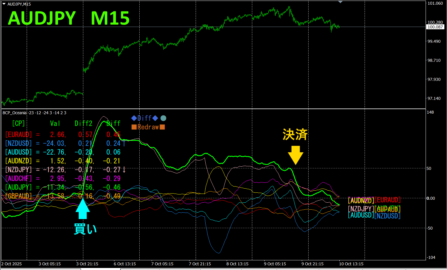 上半分は、AUDJPYの15分足チャートです。下半分は、「8CP見える化インジケータ」によるものです、緑太線のグラフがAUDJPYに相当します