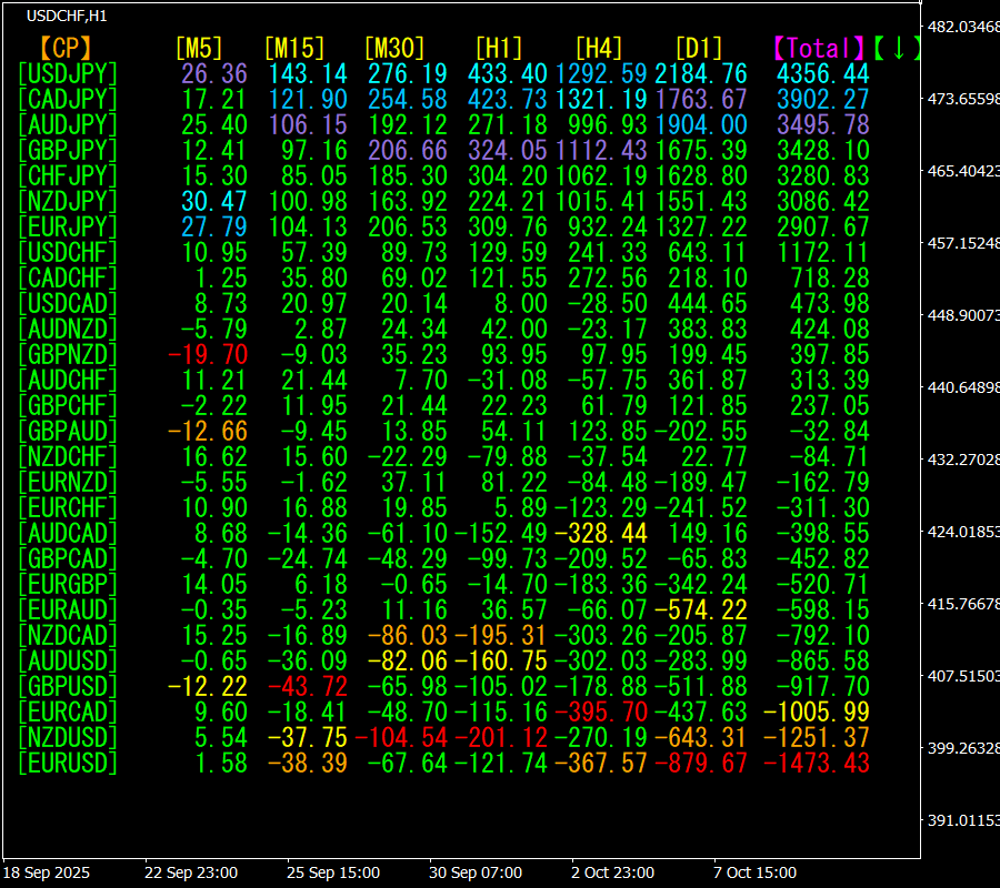 [Total]数値の降順に並んでいます。一番上にあるUSDJPYは、全ての時間足で青色系の表示色になっています。Total数値が4356.44と、極端に大きなプラスの数字になっています。USDJPYに大きな上昇トレンドが発生していることが示されます。