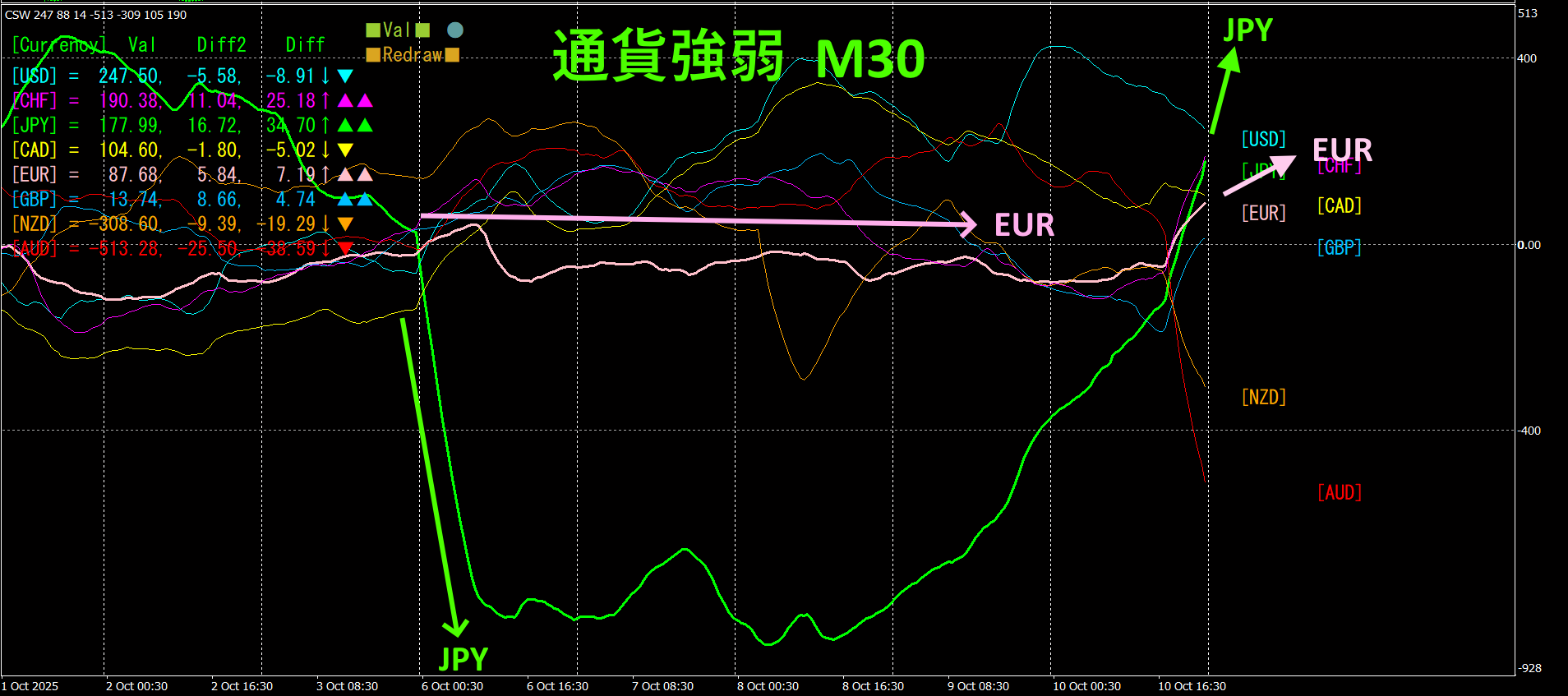 ピンク色がEUR、緑色がJPYです。通貨強弱チャートで、EURはほとんど水平なのに対し、JPYは大きく下落しています。今後の方向としては、JPYがEURよりも上向きになっているので、EURJPYは、下降気味に推移するものと考えられます。