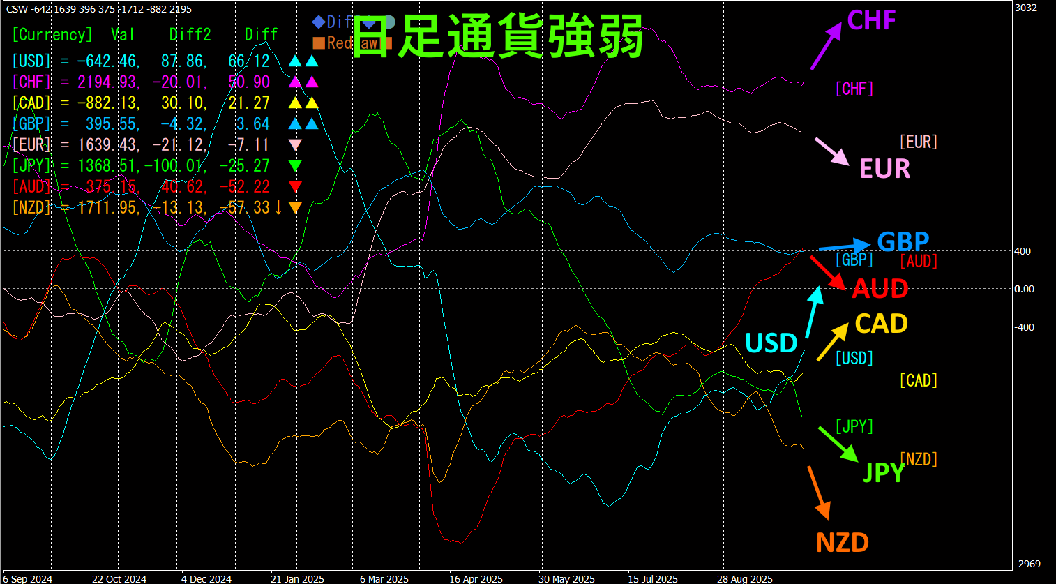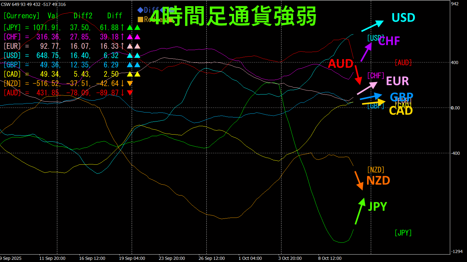 4時間足では、JPY、CHF、EUR、USD、GBP、CADが上向きに、AUD、NZDが下向きになっています。