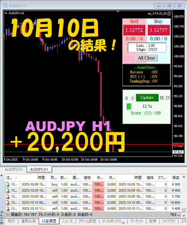 【前日の結果】AUDJPY H1 / M5 『ATS-25』10月10日