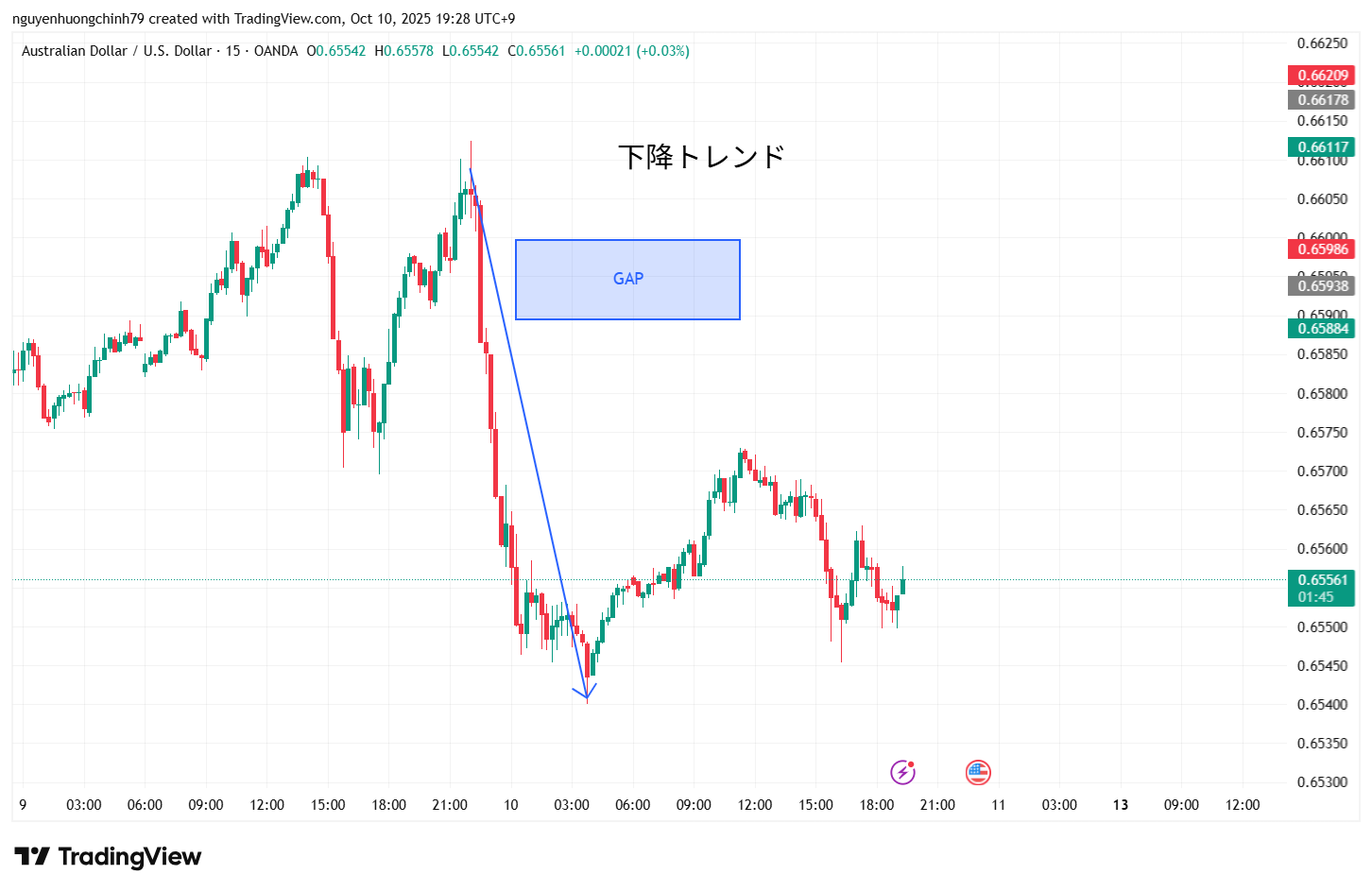 2025年10月10日、日本時間19:29頃、15分足チャートのAUDUSDペアを分析しました。