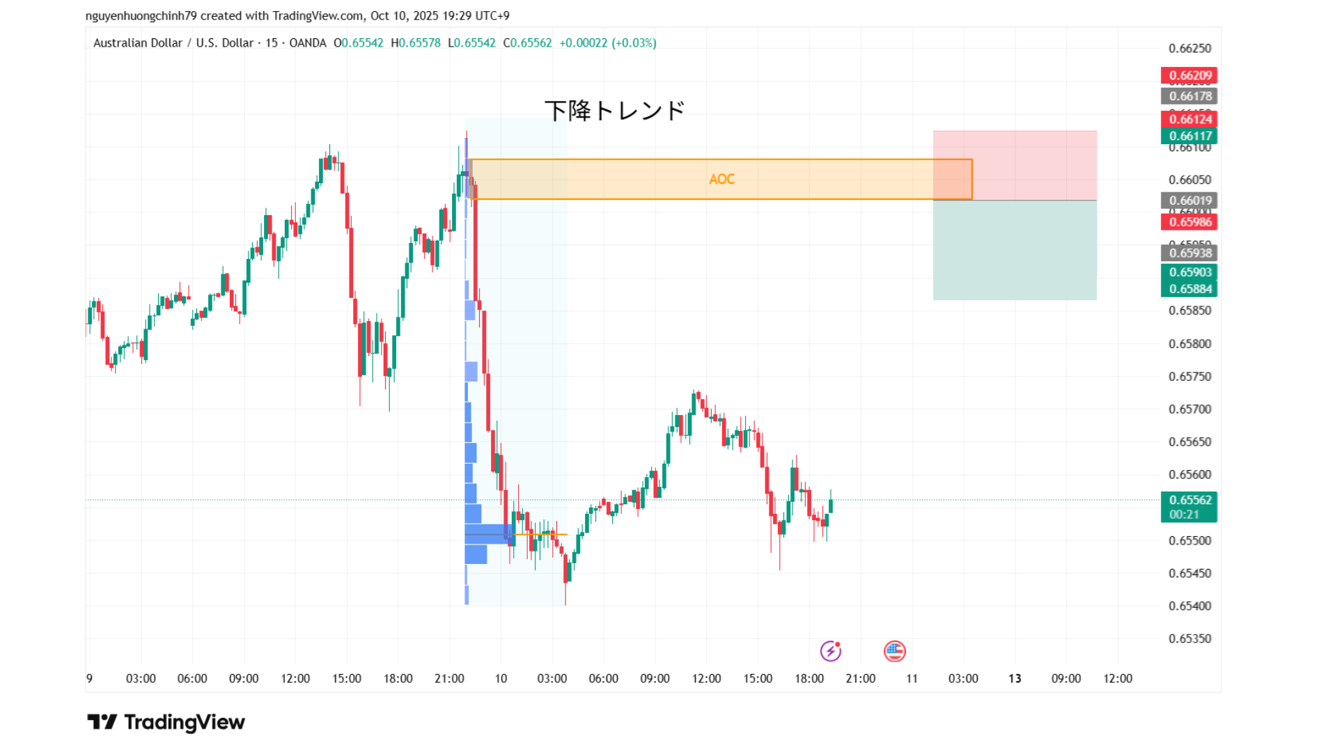 この分析をさらに裏付けるため、直近の値動きをVolume Profileで分析しました。その結果、AOC (Area of Control)、つまり大量の出来高が集中したゾーンが0.66019付近にあることがわかりました。これは売り勢力が積極的に参加したポイントであり、価格が戻ってきた際のレジスタンスゾーンになる可能性が高いと考えられます。
