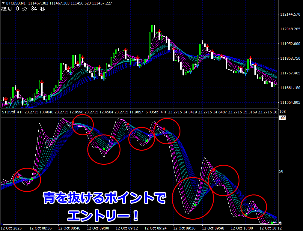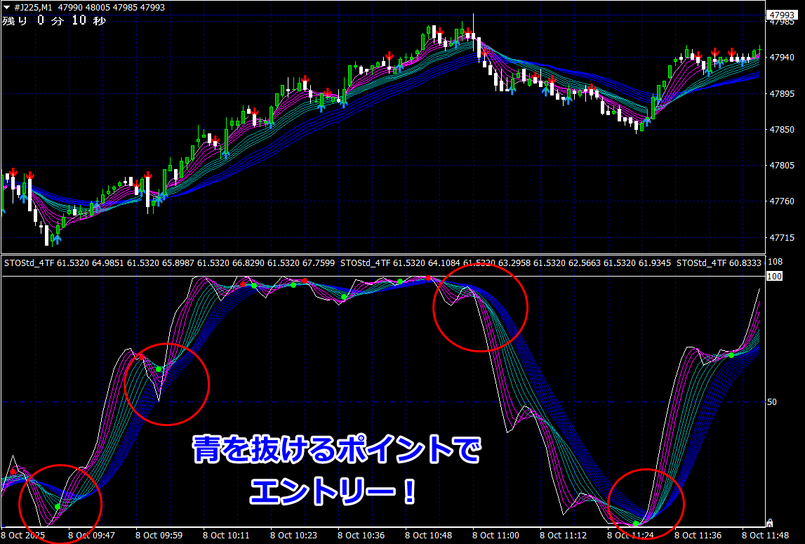インジケーターの帯はピンク・緑・青の3層構造で、3層の帯は、収斂と拡散を繰り返しますので、 上昇時は、上から ピンク・緑・青 の並びとなり、下落時は、その逆で、上から青・緑・ピンクの並びになります。