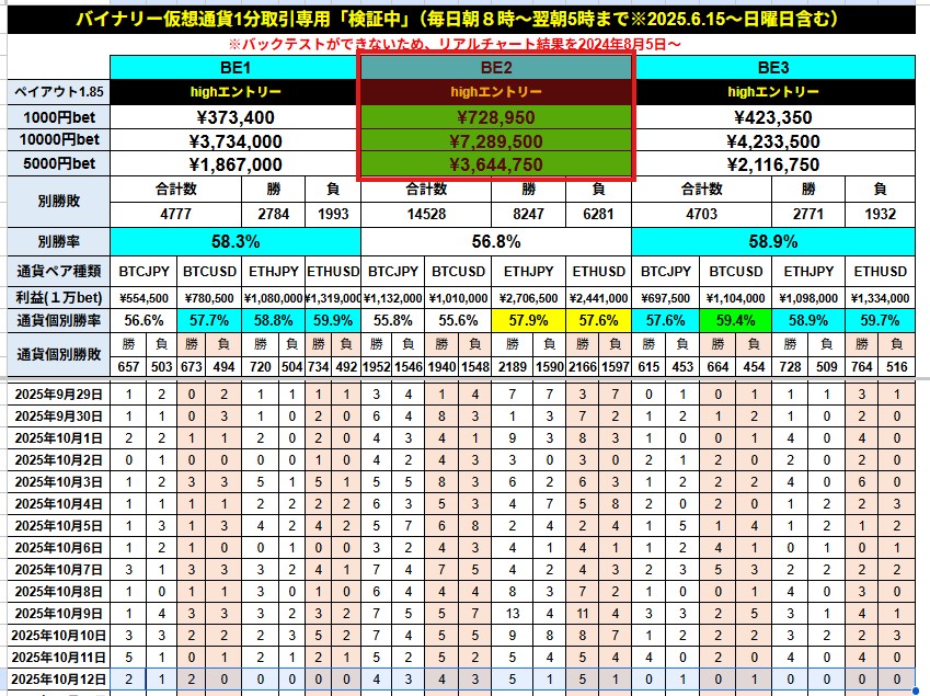 【週報:2025.10.6-2025.10.12】バイナリー仮想通貨1分足判定用 オリジナルツール「BE」結果
