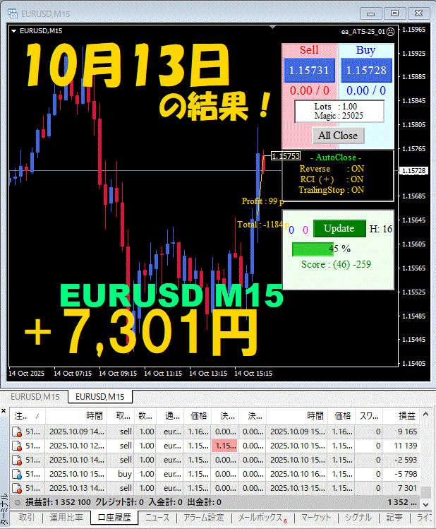 【EURUSD M15】前日の結果『ATS-25』 10月13日