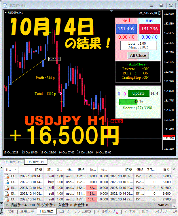 【前日の結果】USDJPY H1 / M5 『ATS-25』10月14日