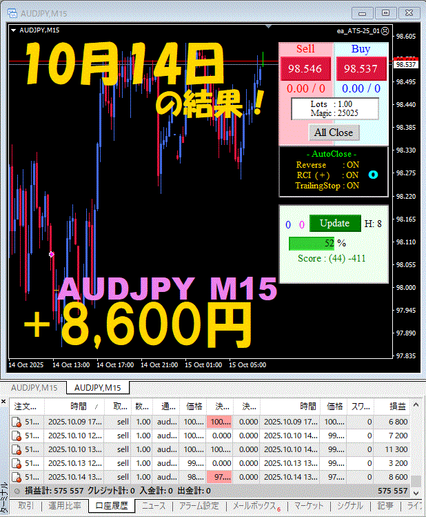 【AUDJPY M15】前日の結果『ATS-25』 10月14日
