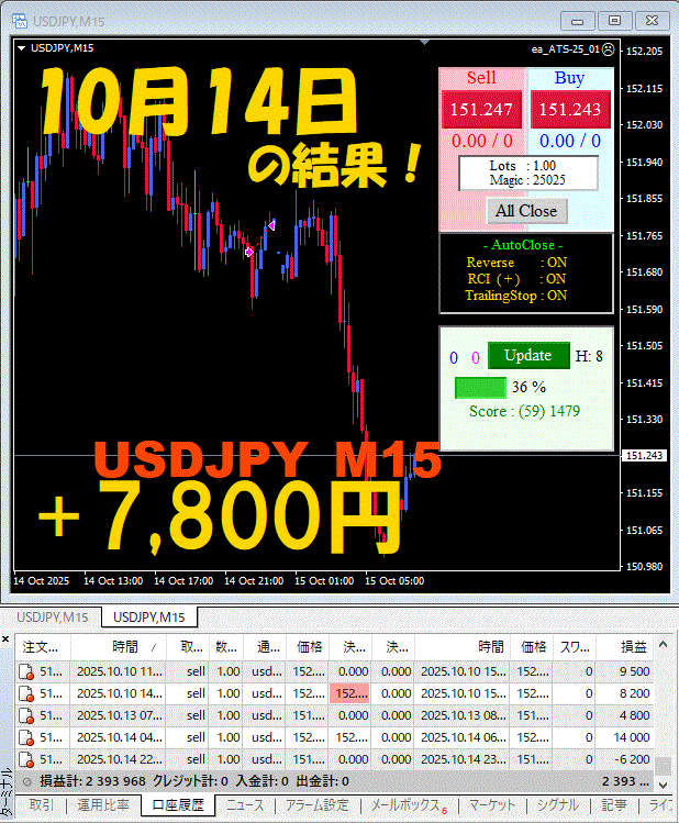 【USDJPY M15】前日の結果『ATS-25』 10月14日