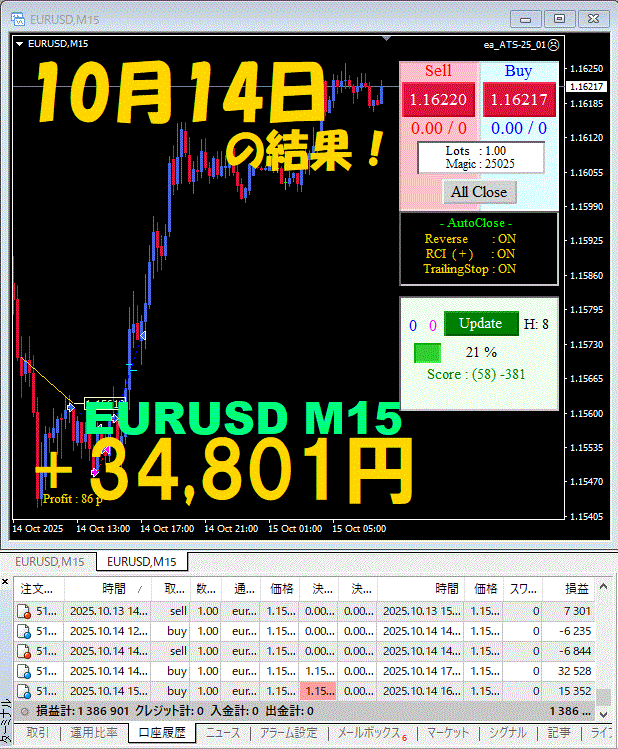 【EURUSD M15】前日の結果『ATS-25』 10月14日
