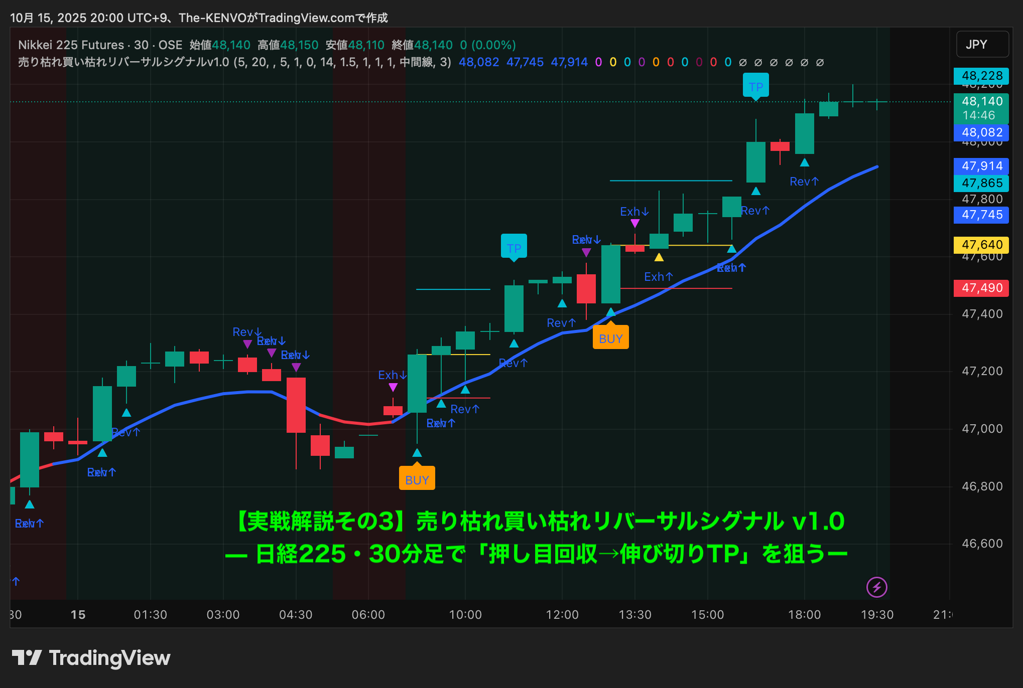 【実戦解説その3】売り枯れ買い枯れリバーサルシグナル v1.0 — 日経225・30分足で「押し目回収→伸び切りTP」を狙う