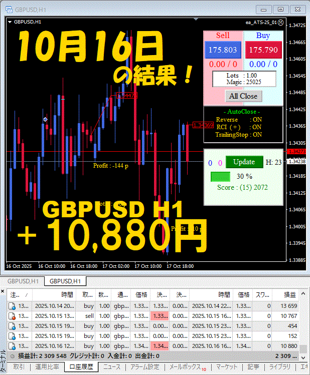 【前日の結果】GBPJPY H1 / M5 『ATS-25』10月16日