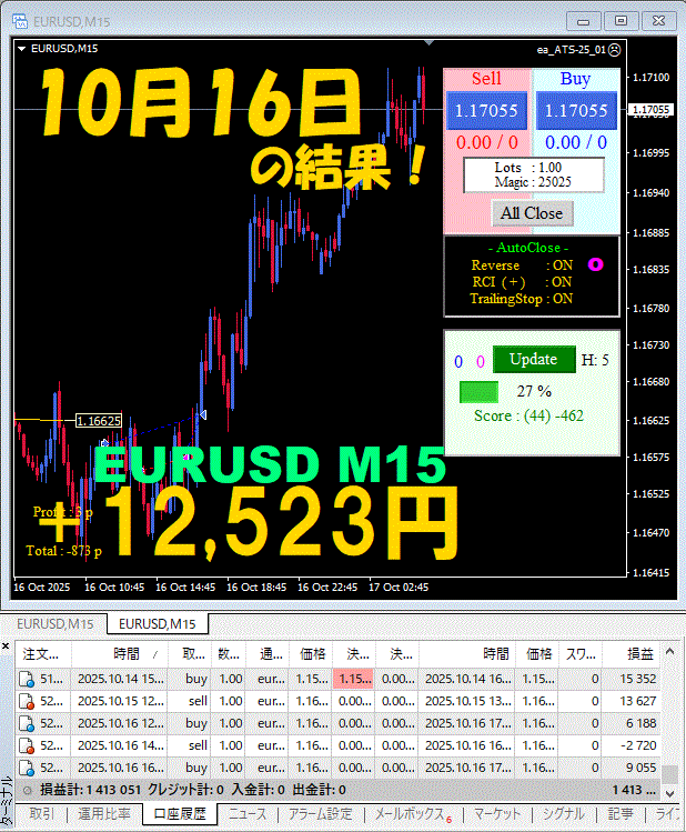 【EURUSD M15】前日の結果『ATS-25』 10月16日