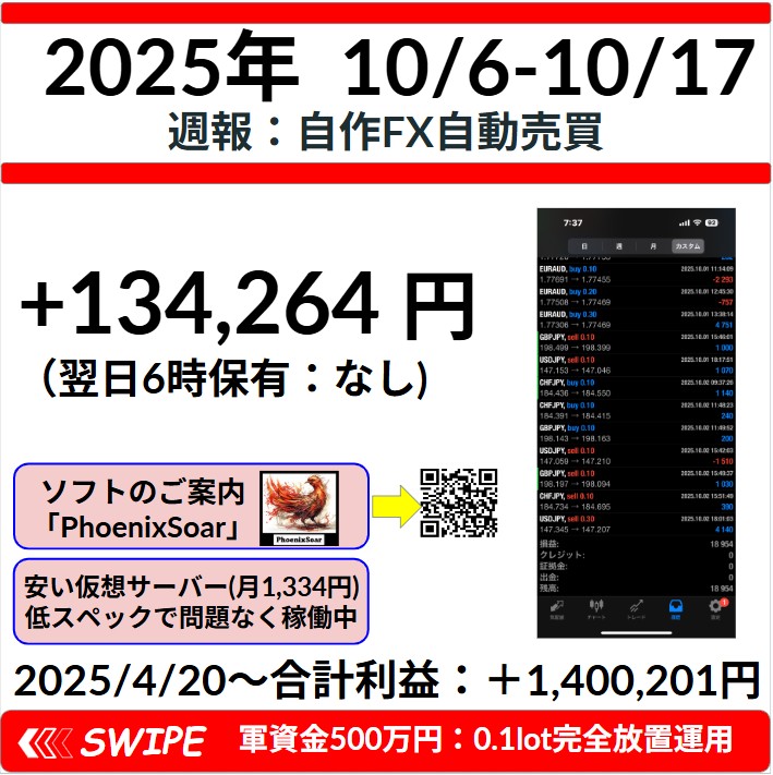 2週まとめて【週報:2025.10.6-2025.10.17】オリジナルEA「PhoenixSoar」の成績報告