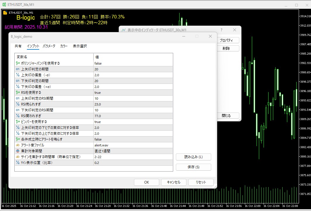 下記、無料ダウンロード可能EAによるお手軽形成した30秒チャートにB-logicを導入してパラメータを設定しました。