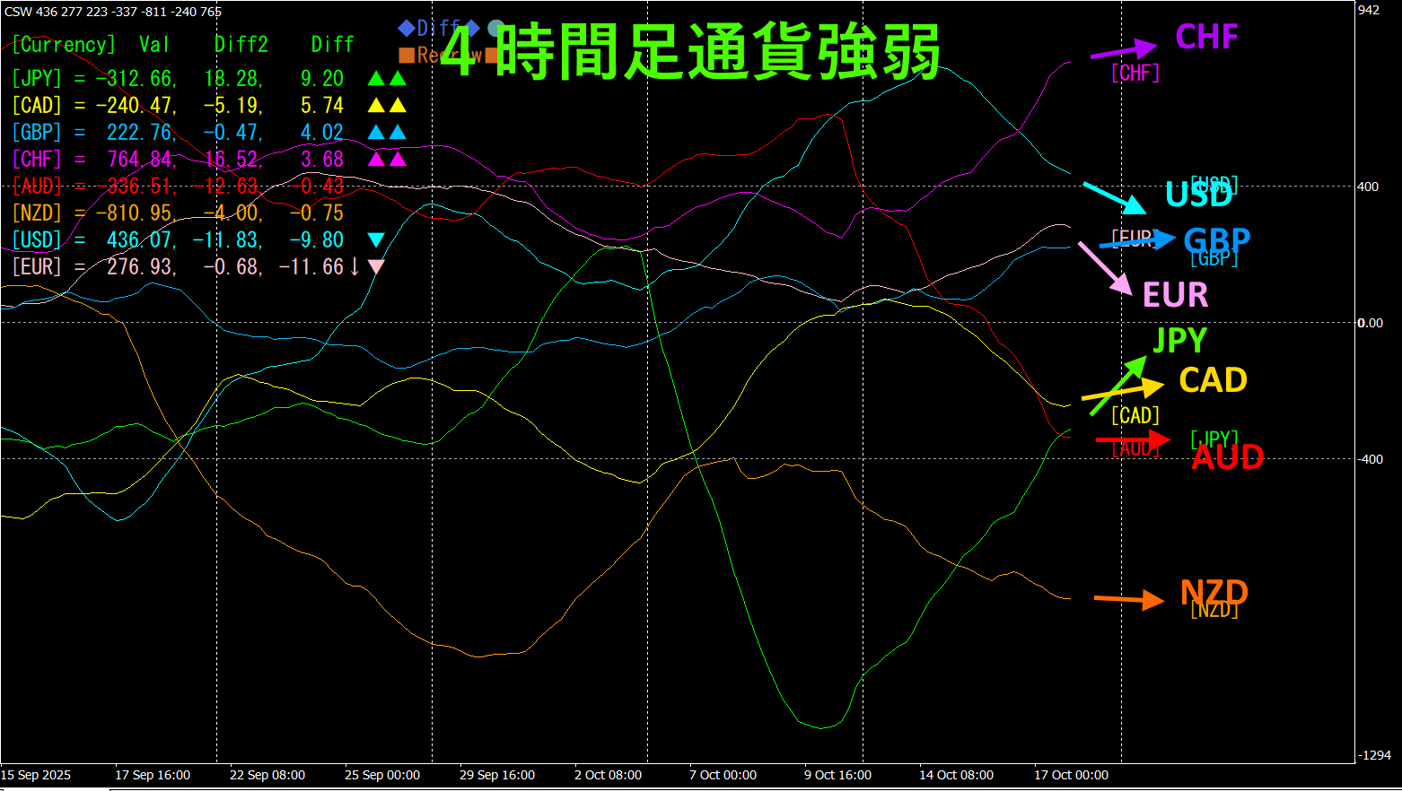 4時間足では、JPY、CAD、GBP、CHFが上向きに、AUD、NZDは水平に、EUR、USDが下向きになっています。
