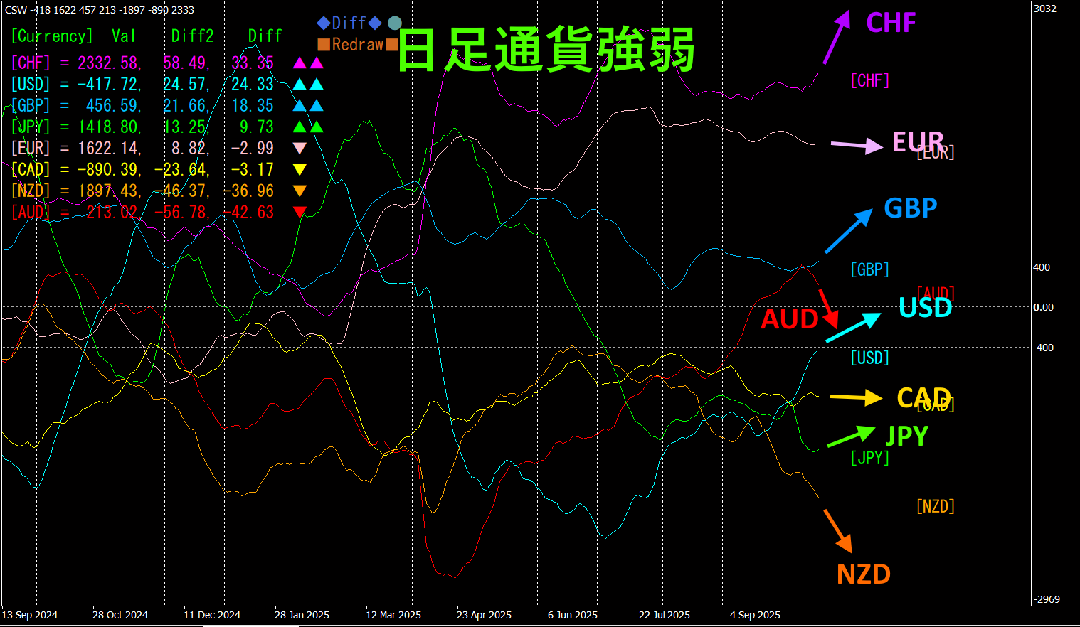 CHF、USD、GBP、JPYが上向きです。AUD、NZD、CAD、EURが下向きになっています。日足では、CHFの上昇とAUDの下落が目立っています。