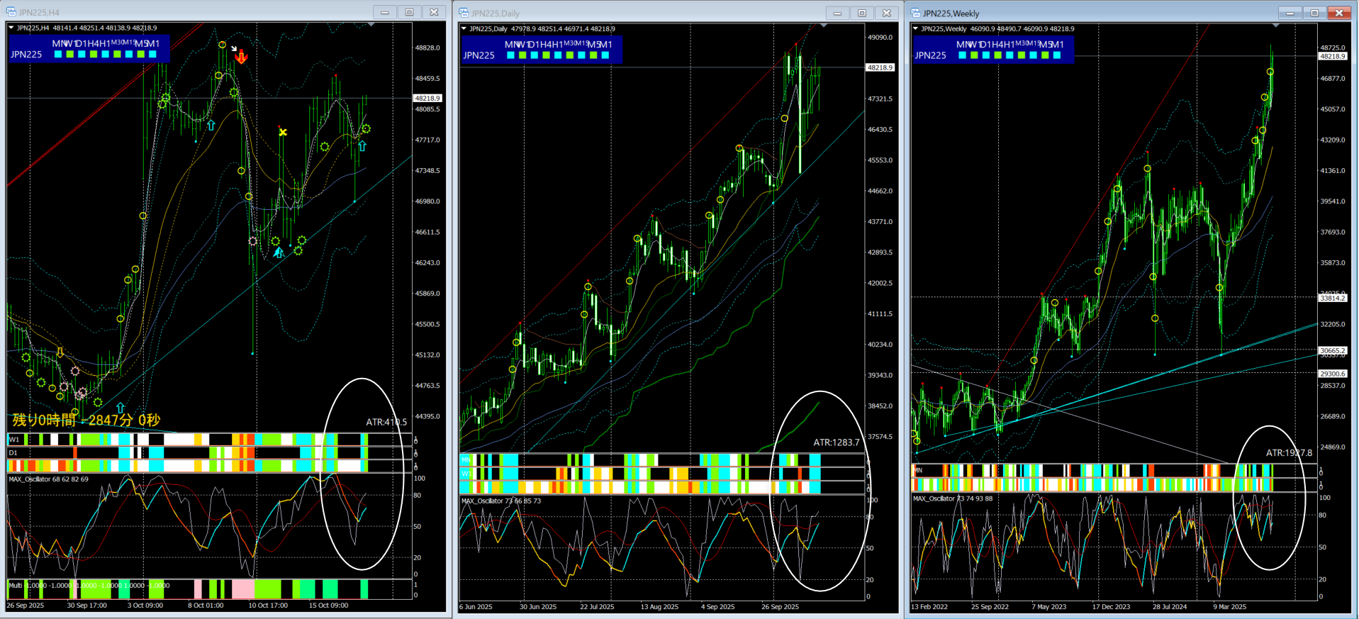 一方で、週足のMAXオシレーター、シンクロバンドは「弱い上昇」を示唆